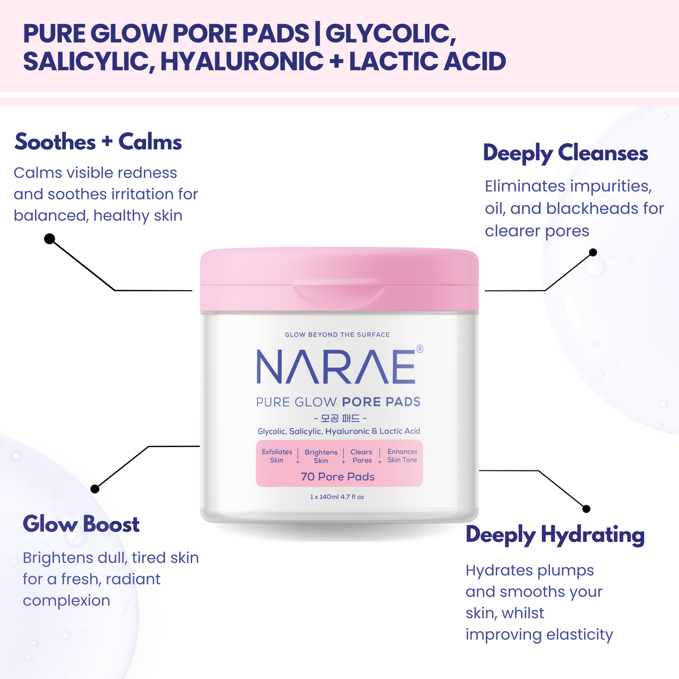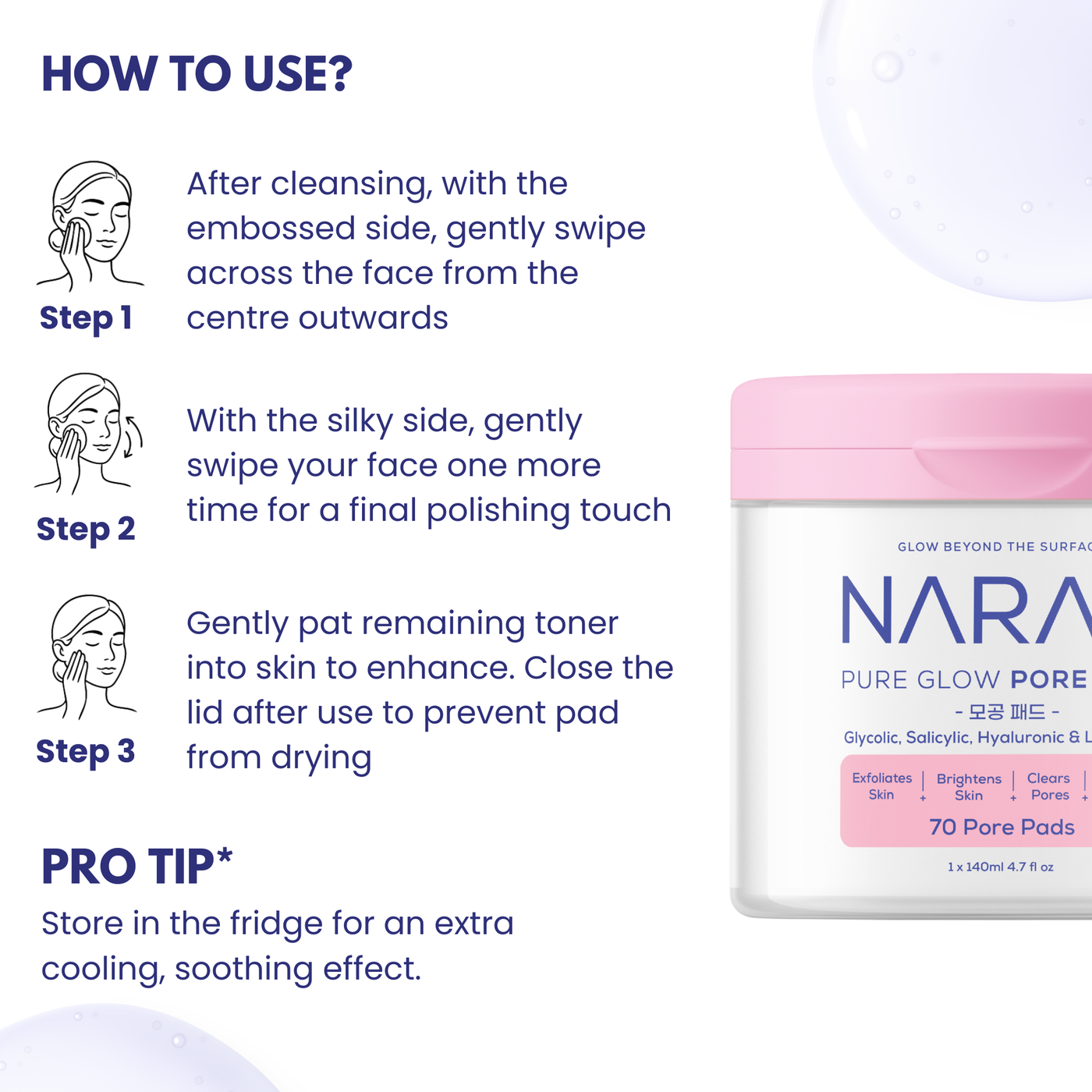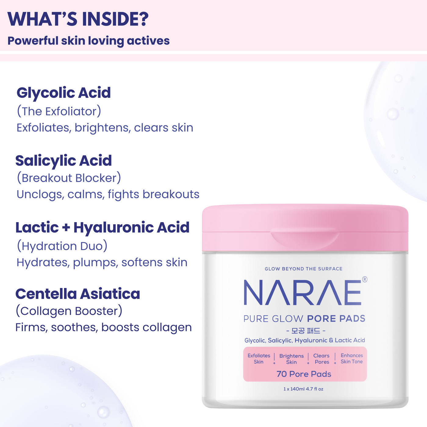 Meet your new glow ritual Pure Glow Pore Pads, the effortless daily exfoliating treatment that keeps your skin clear, bright, and baby-smooth. Powered by a dermatologist-approved blend of Glycolic Acid, Salicylic Acid, Lactic Acid, and Hyaluronic Acid, these toner-infused pads unclog pores, sweep away dullness, and boost radiance all while keeping your skin hydrated and happy.